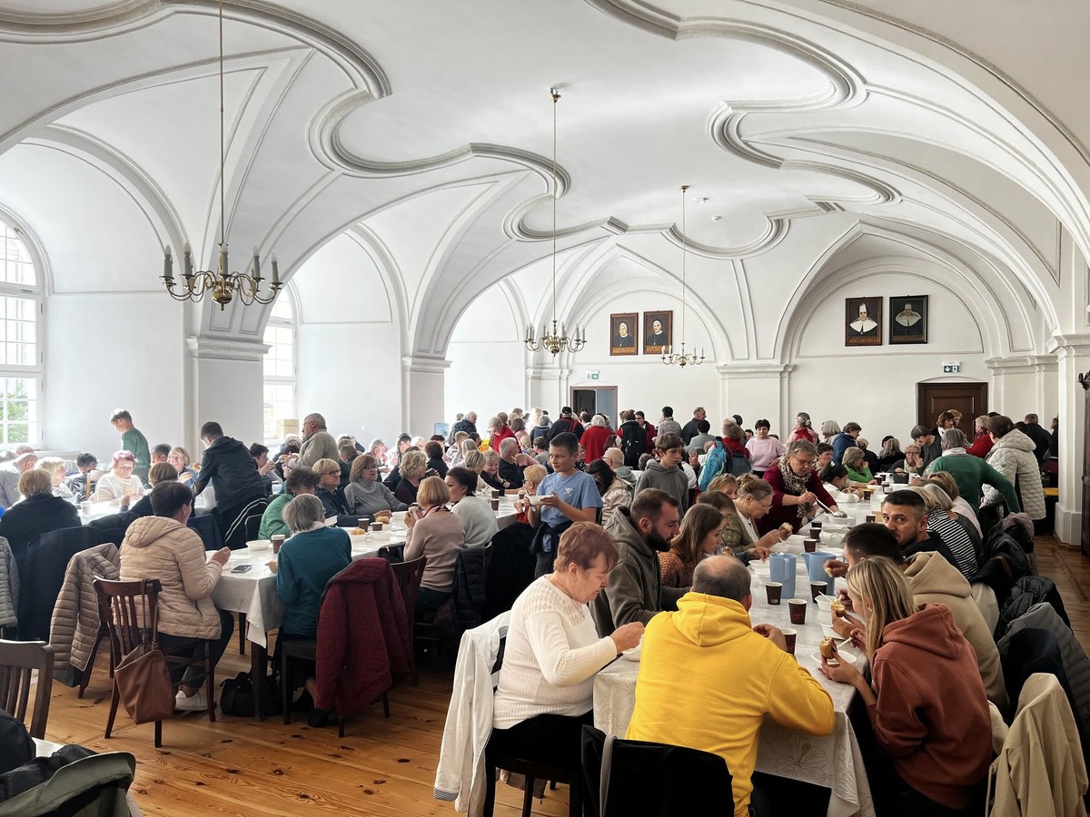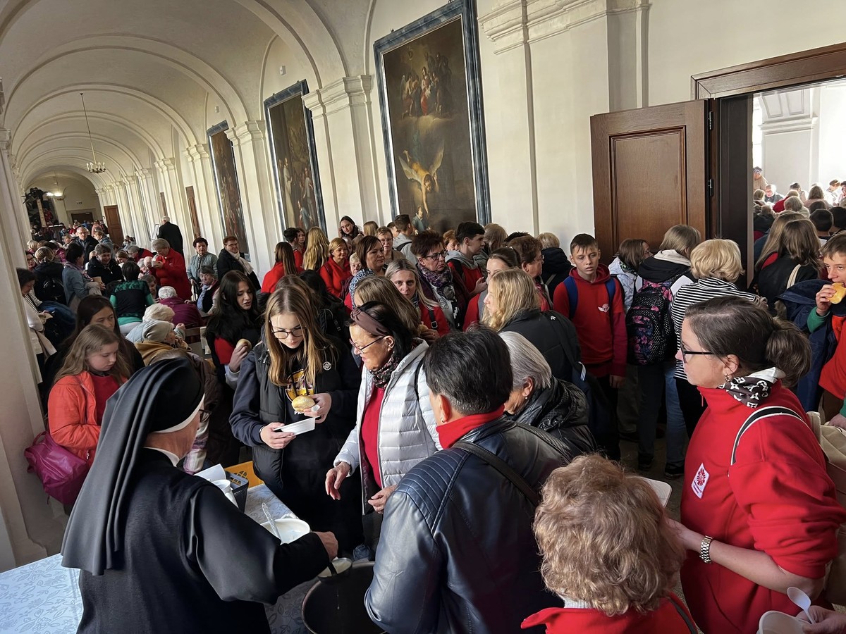 Po Eucharystii pielgrzymi udali się do refektarza i krużganków klasztoru Sióstr Boromeuszek, gdzie czekała na nich gorącą strawa, herbata i ciasta. Swoją konferencję dyrektor Caritas Diecezji Opolskiej poświęcił znakowi nadziei, którym było pojednanie polsko-niemieckie zapoczątkowane listem biskupów polskich napisanym w Rzymie z ław Soboru Watykańskiego II. Jako puenta mocno wybrzmiały słowa „Jak Wawel Wawelem może być Niemiec Polakowi przyjacielem." Potwierdzającym argumentem tych słów była miłość młodej dziewczyny z Bawarii imieniem Jadwiga do znakomitego władcy polskiego tamtej epoki Księcia Henryka. A także przyjaźń Polaka wszechczasów Jana Pawła II do Bawarczyka Kard. Josepha Ratzingera. Wolontariusze Szkolnych Kół Caritas (tzw. akwarium Caritas) spotkali się we własnym gronie ze swoimi opiekunami. Ich liczna obecność na pielgrzymce wszystkich napawała radością.