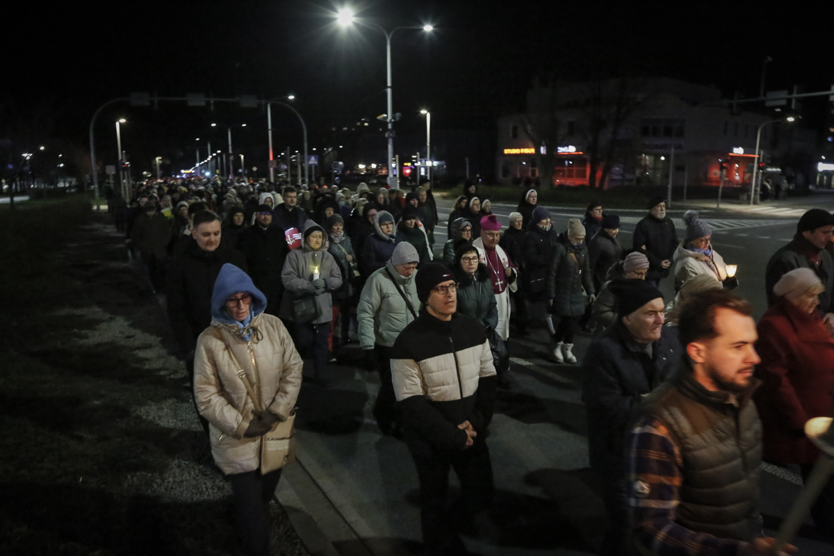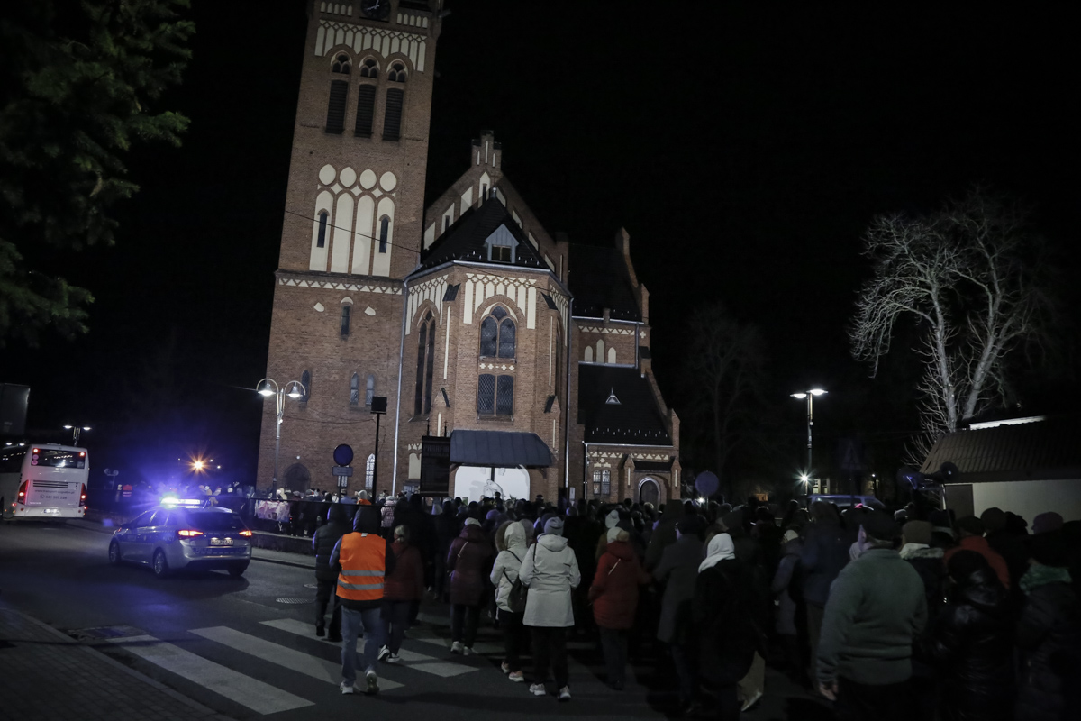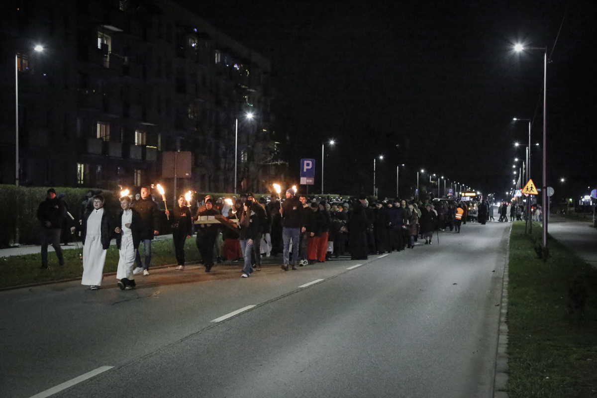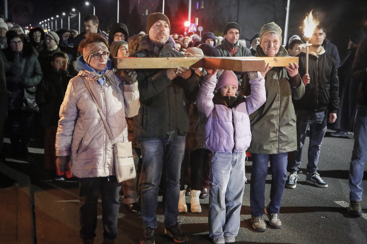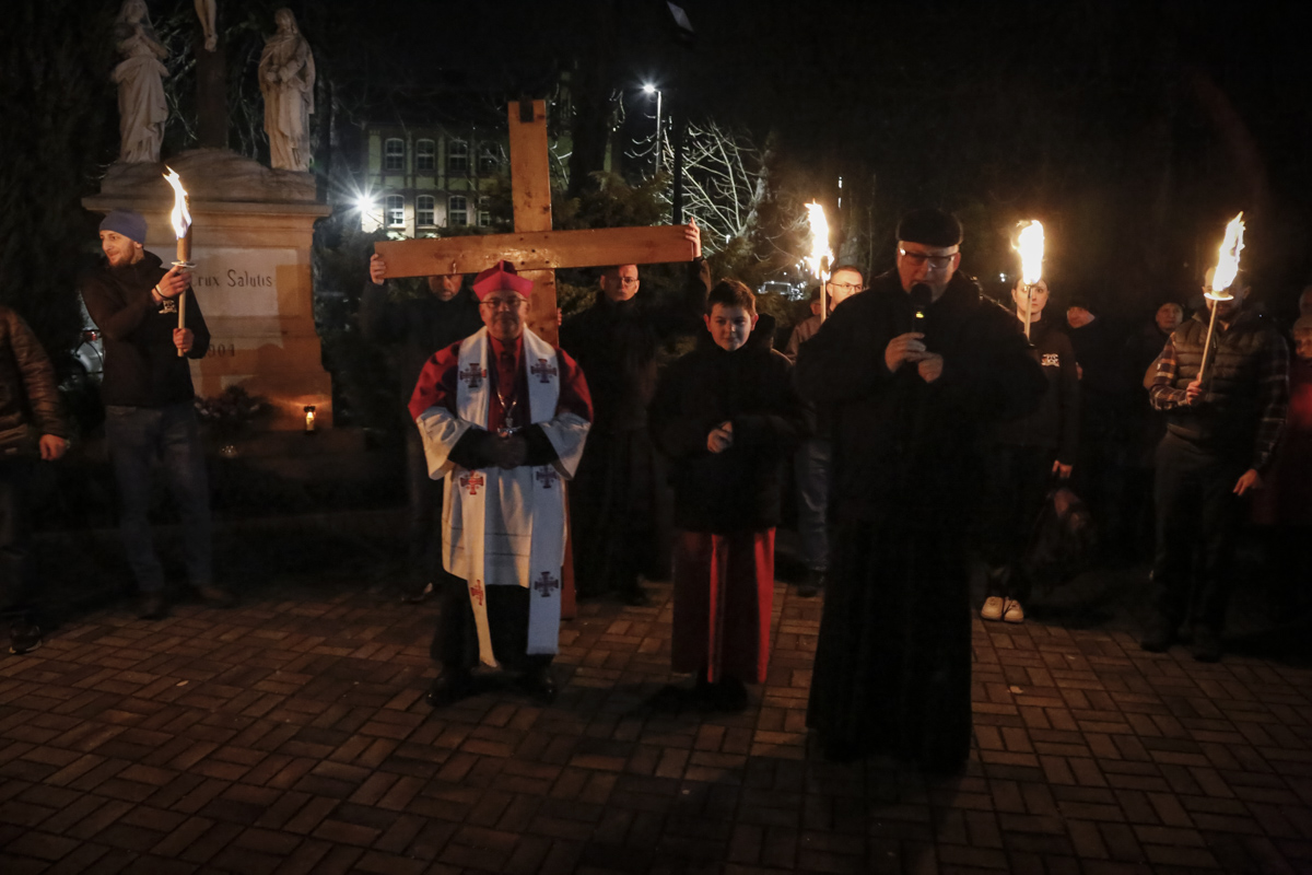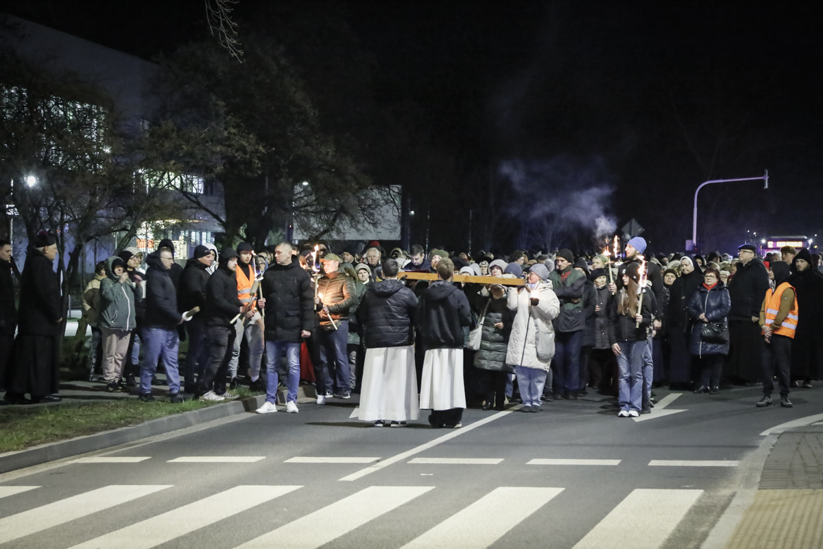 Dzisiejszy piątkowy wieczór był czasem, w którym mogliśmy dekanalnie przeżyć nabożeństwo Drogi Krzyżowej oraz razem uczestniczyć we Mszy Świętej sprawowanej przez naszego biskupa pomocniczego Rudolfa Pierskały w koncelebrze z księżmi z całego dekanatu. Podczas Mszy Świętej bp Rudolf skierował do nas słowa, które było wstępem do nabożeństwa Drogi Krzyżowej prowadzonego wśród ulic naszego miasta. W tym roku przeszliśmy z naszej parafii do parafii św. Mikołaja zatrzymując się przy stacjach Drogi Krzyżowej, która w 2007 została zatwierdzona przez papieża Benedykta XVI, a jej autorem był kardynał Gianfranco Ravasi. Stacje, które rozważaliśmy, pochodzą wyłącznie z Ewangelii. Każde wydarzenie tej drogi jest zapisane w Piśmie Świętym. Nie ma tu scen dopowiedzianych przez tradycję ani obrazów, które zrodziła pobożność kolejnych pokoleń. Jest tylko Ewangelia. To tak zwana biblijna Droga Krzyżowa. Przeszliśmy razem drogę Jezusa. Od ogrodu oliwnego aż po ciszę grobu. Ale ta droga nie kończy się tutaj. Bo krzyż nie jest ostatnim słowem Boga. Ostatnim słowem jest życie. "Kiedy wrócimy do swoich domów, do codziennych spraw, do zwyczajnych obowiązków, ta droga krzyżowa może zostać z nami w inny sposób. Może nauczy nas większej wrażliwości na ludzi, których spotykamy każdego dnia. Na tych, którzy niosą swoje krzyże w milczeniu. Na tych, którzy potrzebują pomocy. Na tych, którzy czekają na jedno dobre słowo. Bo droga Jezusa prowadzi przez ludzkie życie. Przez nasze ulice. Przez nasze domy. Przez nasze serca."