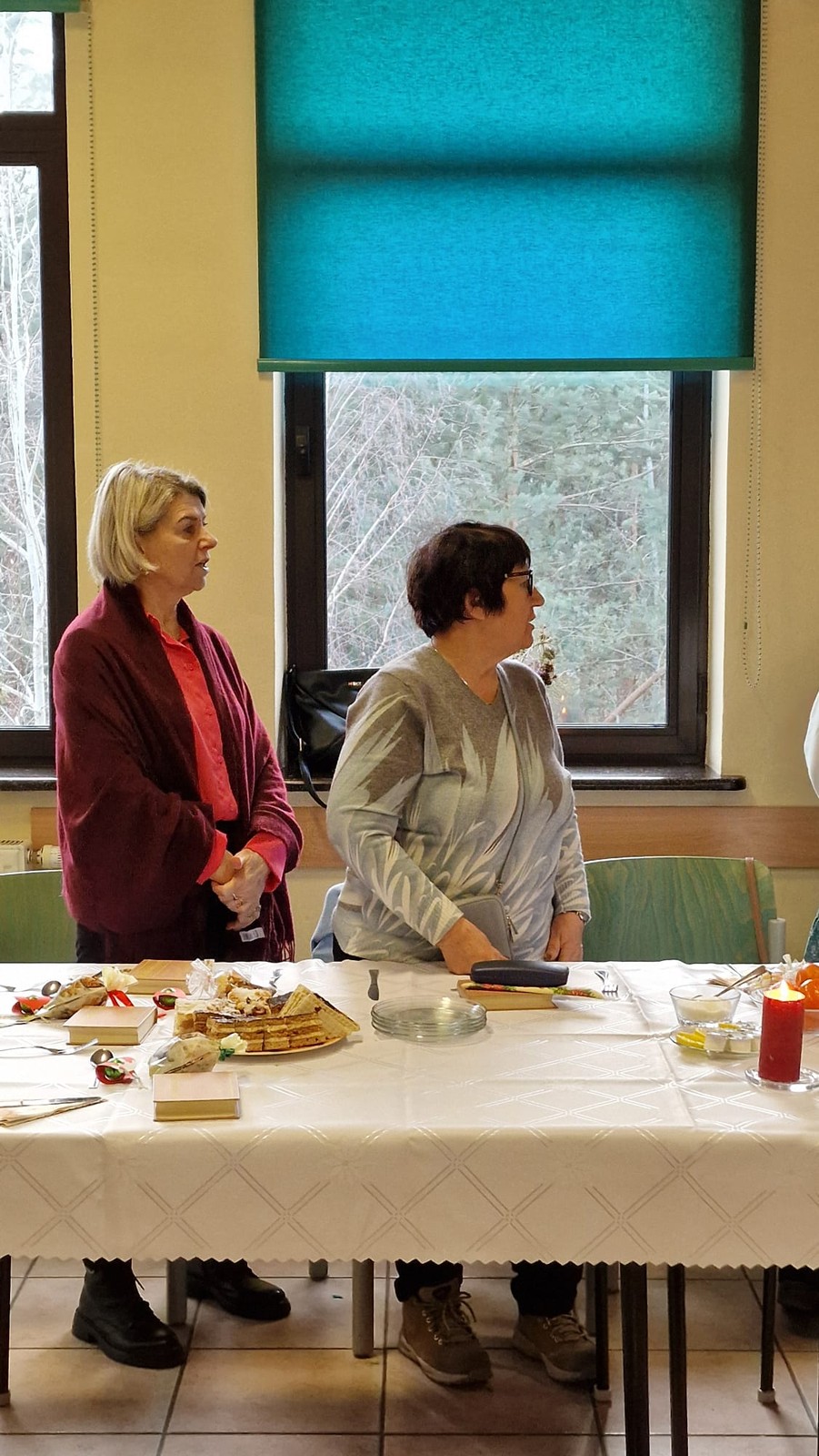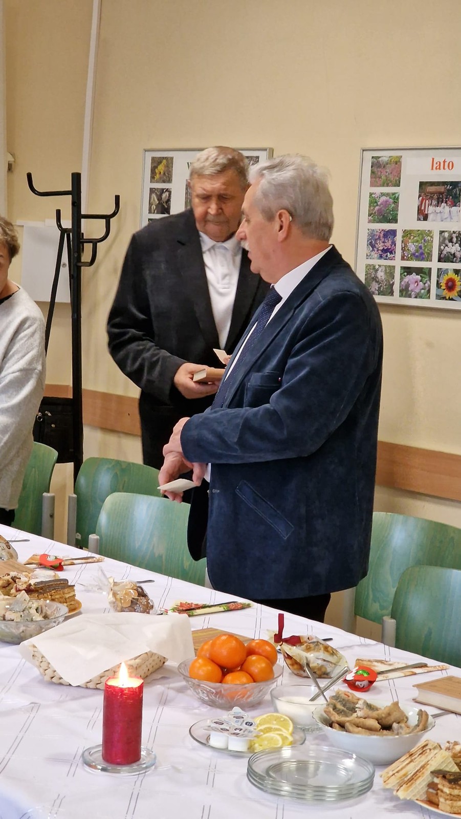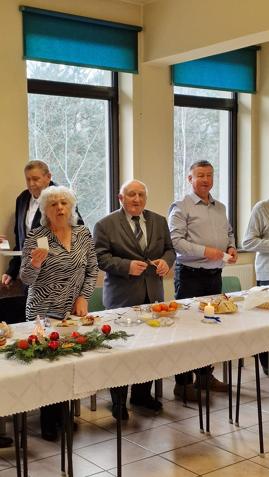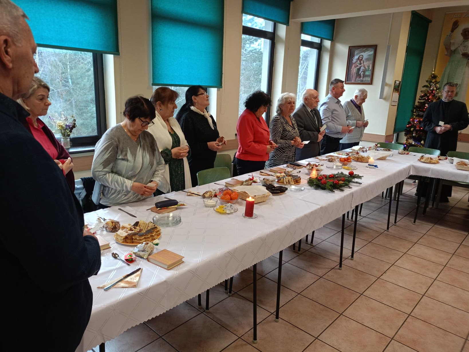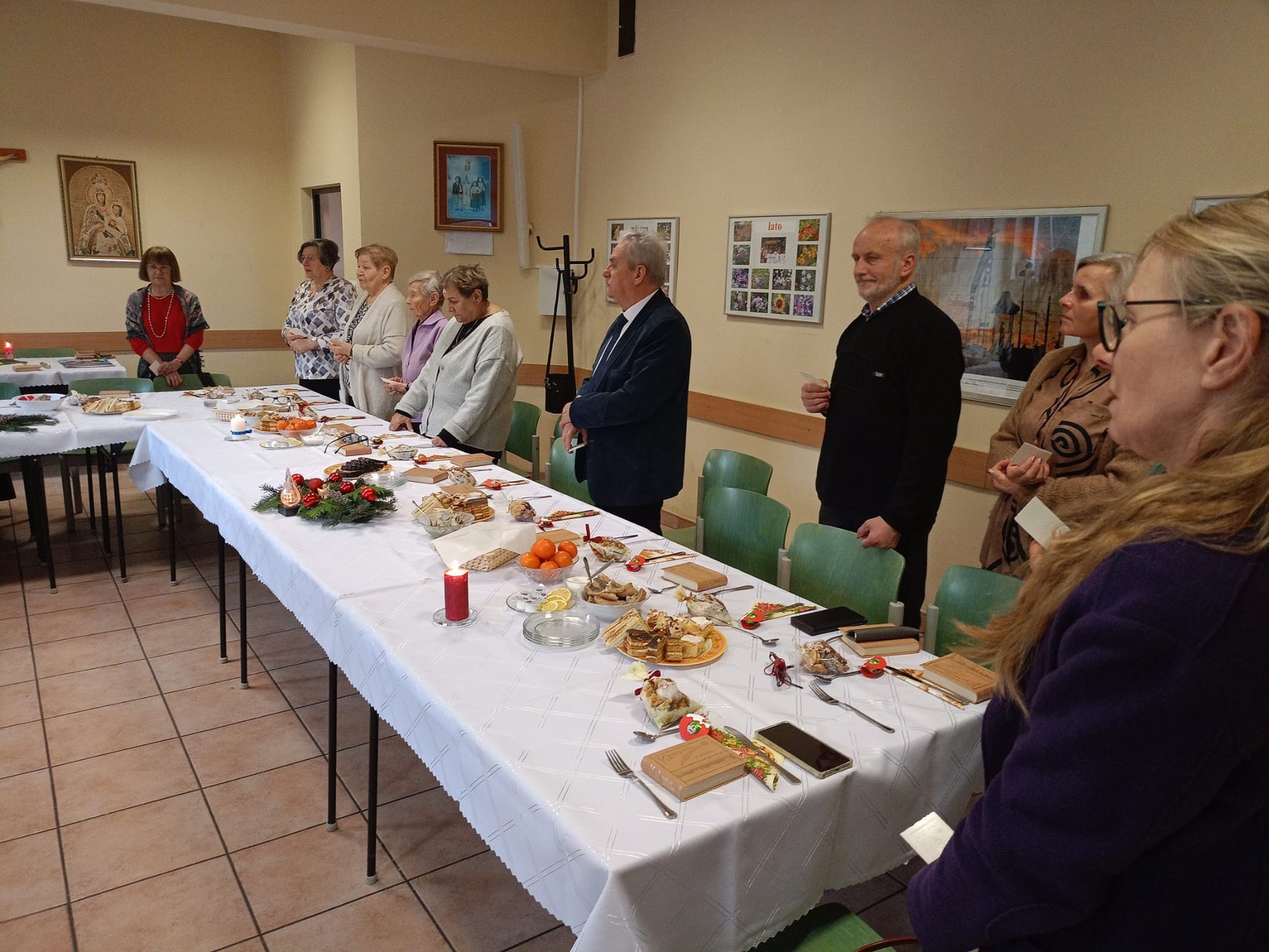 W początkach działalności koła, potrawy wigilijne przygotowywały nasze panie, ale obecnie zamawiamy catering w restauracji U Alojza w Starym Ujeździe. Potrawy dla nas tam przygotowane są tradycyjne - postne i smaczne. Kolędy i pastorałki śpiewamy z kantyczek, które od lat są w posiadaniu naszego ks.proboszcza. Lubimy z nich śpiewać, gdyż wśród nich są takie, których nie ma w naszych modlitewnikach. Z nami jest ks. Proboszcz, ks. Grzegorz, ks. Paweł, zabrakło ks. Michała, którego w tym dniu nie było w parafii, a także ks proboszcza z Pogorzelca, który też musiał wyjechać. Radosny czas kolędowy dobiega końca. Mamy nadzieję, że za rok spotkamy się znów.