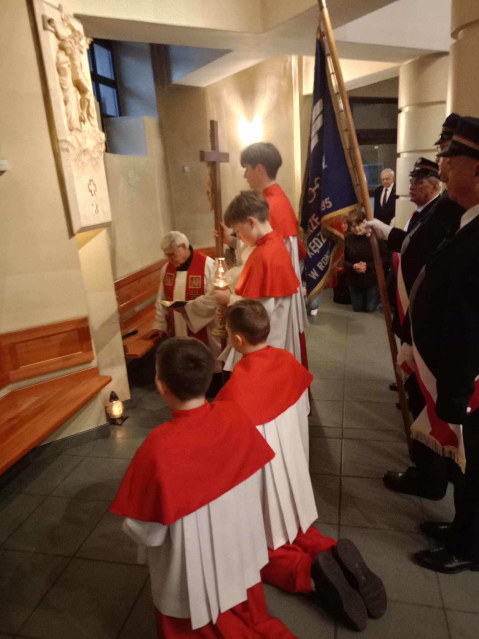 Od czasu kiedy w czwartek 18 lutego 2021r. o. Wiktor Lata, nasz parafianin, dokonał erygowania i poświęcenia Drogi Krzyżowej w naszym kościele, a kolejarze mieli swój udział w w jej odsłonięciu, każdego roku prowadzimy jako Katolickie Stowarzyszenie Kolejarzy Polskich w naszym kościele Drogę Krzyżową. W tym roku w tym nabożeństwie uczestniczyliśmy 13 marca o godz 17.15. Tradycyjnie kolejarze, którzy jeszcze mają mundury udział w tym nabożeństwie biorą w mundurach. Choć mundury te są już mocno wysłużone to jednak podkreślają rangę tego nabożeństwa. Zawsze w ten dzień zapalamy znicze przed poszczególnymi stacjami Drogi Krzyżowej, które pozostawiamy tam do ostatecznego wypalenia. Także zawsze towarzyszy nam sztandar kolejowy, o który od zarania powołania koła KSKP pieczołowicie dbamy, a którego zabieramy także na pogrzeby bliskich nam zmarłych kolejrzy, jak również na inne uroczystości patriotyczne. Ksiądz Edward, który jest naszym duszpasterzem koła wspólnie z nami modli się wokół kościoła przy każdej stacji, a jedna z naszych koleżanek od ołtarza czyta rozważania poszególnych stacji. Rozważania te rok rocznie są inne.