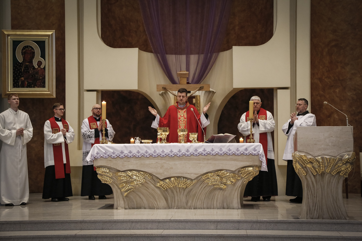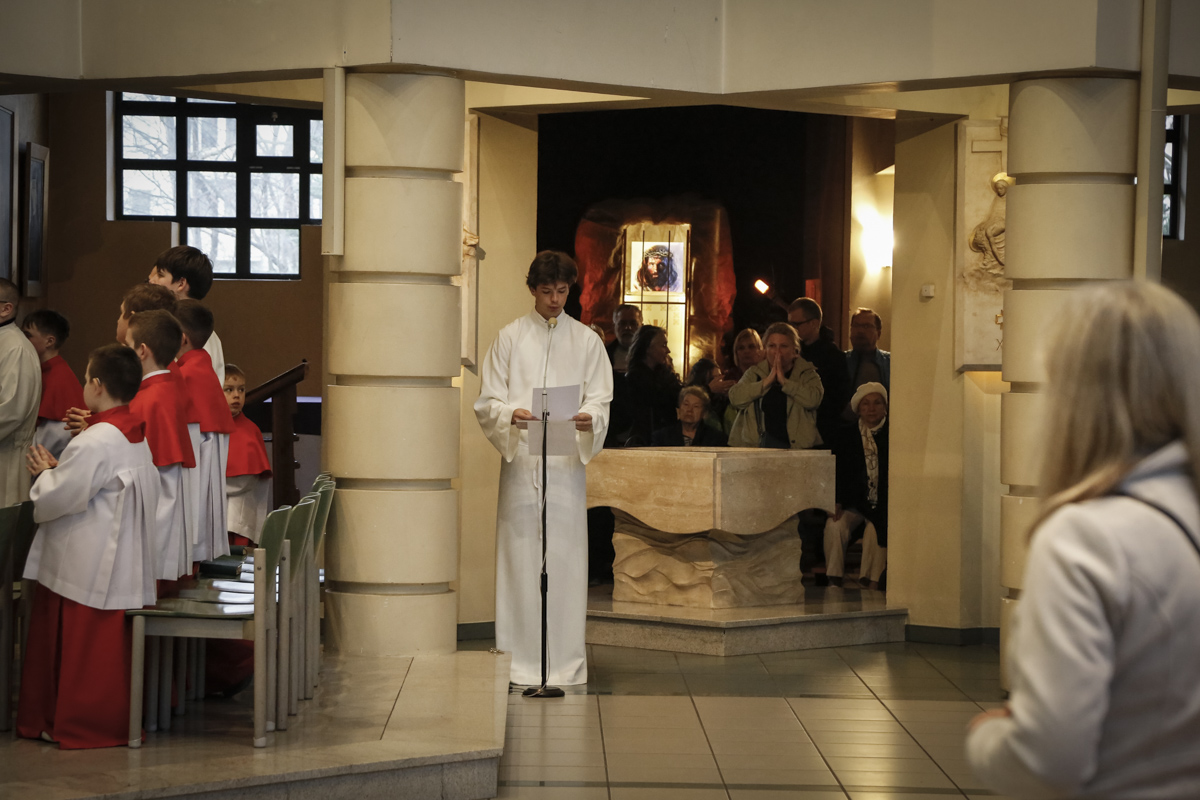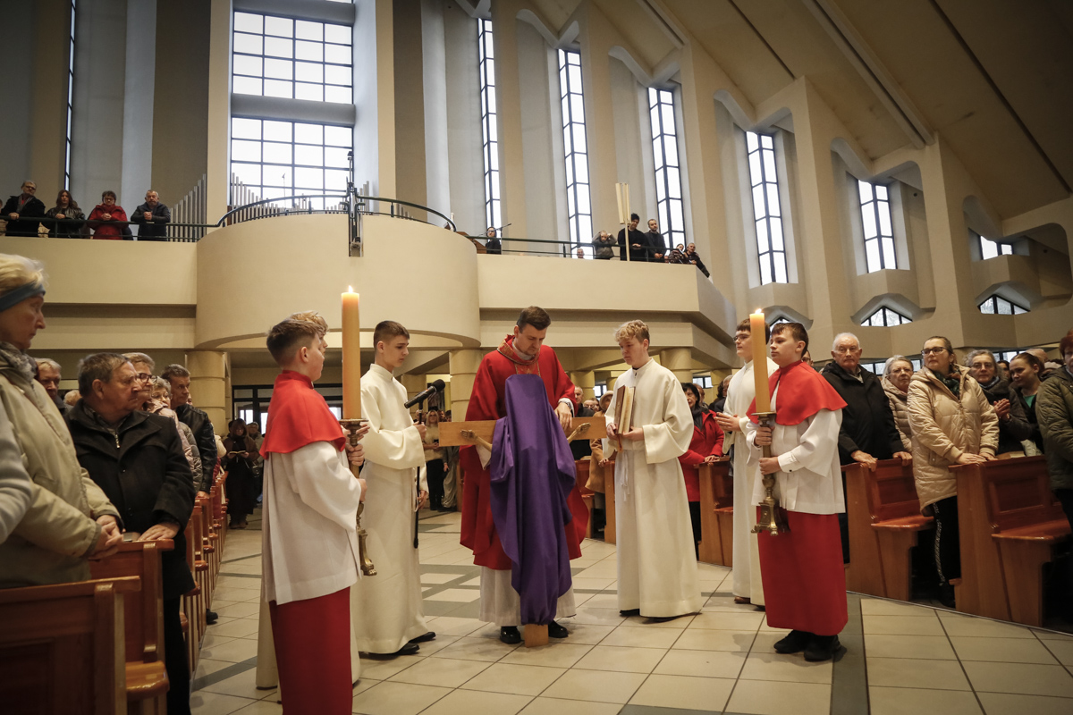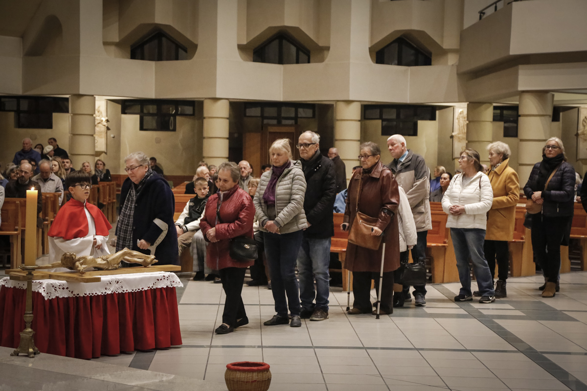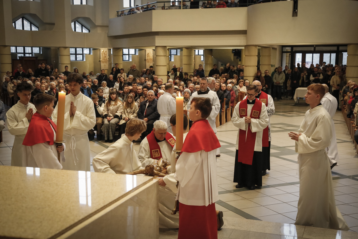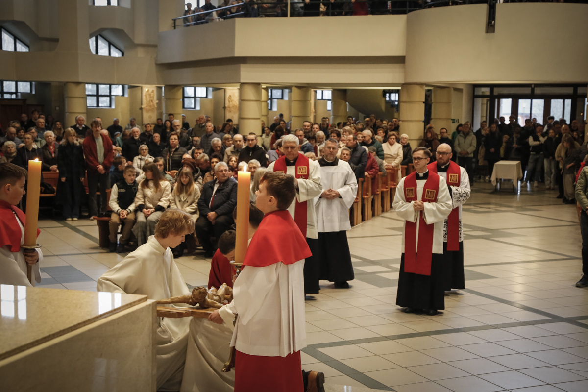 Wielki Piątek to jedyny dzień w roku, w którym Kościół nie sprawuje Mszy świętej. To czas głębokiej ciszy, zadumy nad męką Chrystusa i adoracji narzędzia naszego zbawienia – Krzyża. Centralnym punktem dnia jest wieczorna Liturgia Męki Pańskiej sprawowana u nas o godz. 18:00 pod przewodnictwem ks. Michała, który wygłosił słowo do wiernych. Poniżej można wsłuchać się w jej fragmenty.