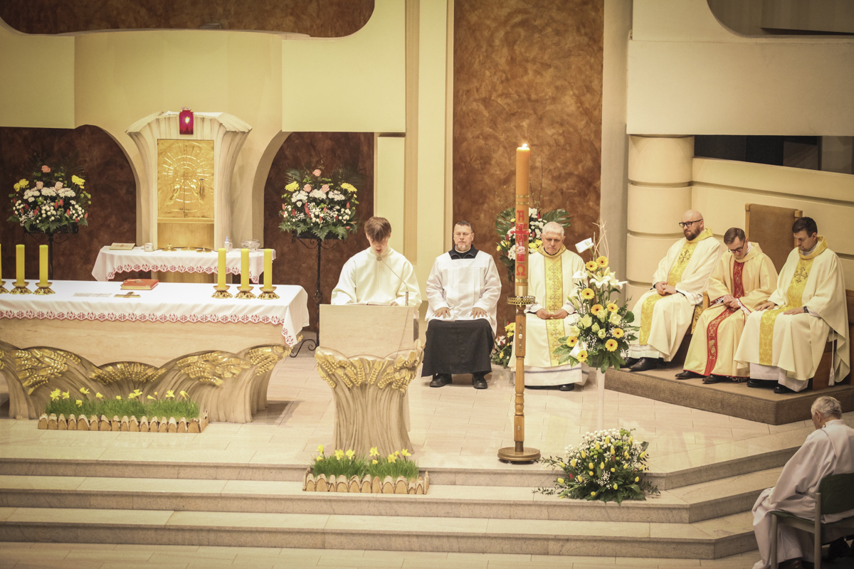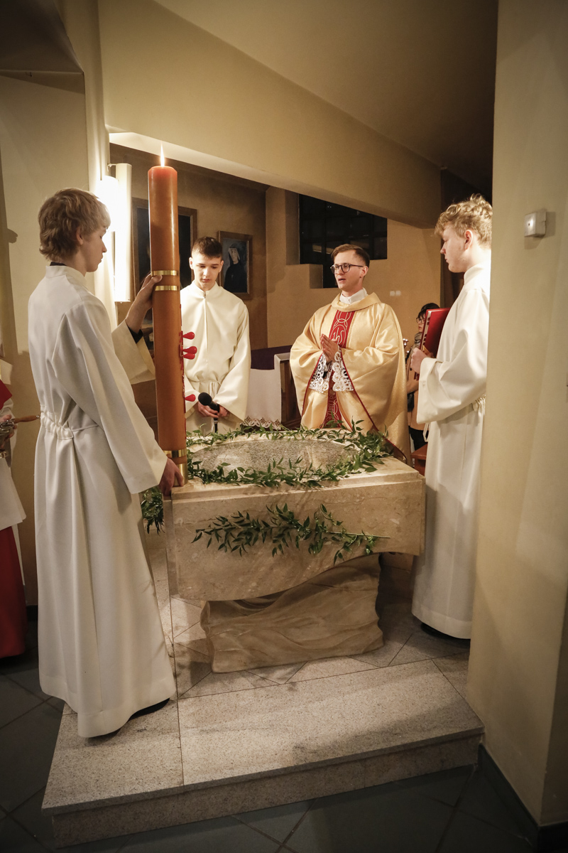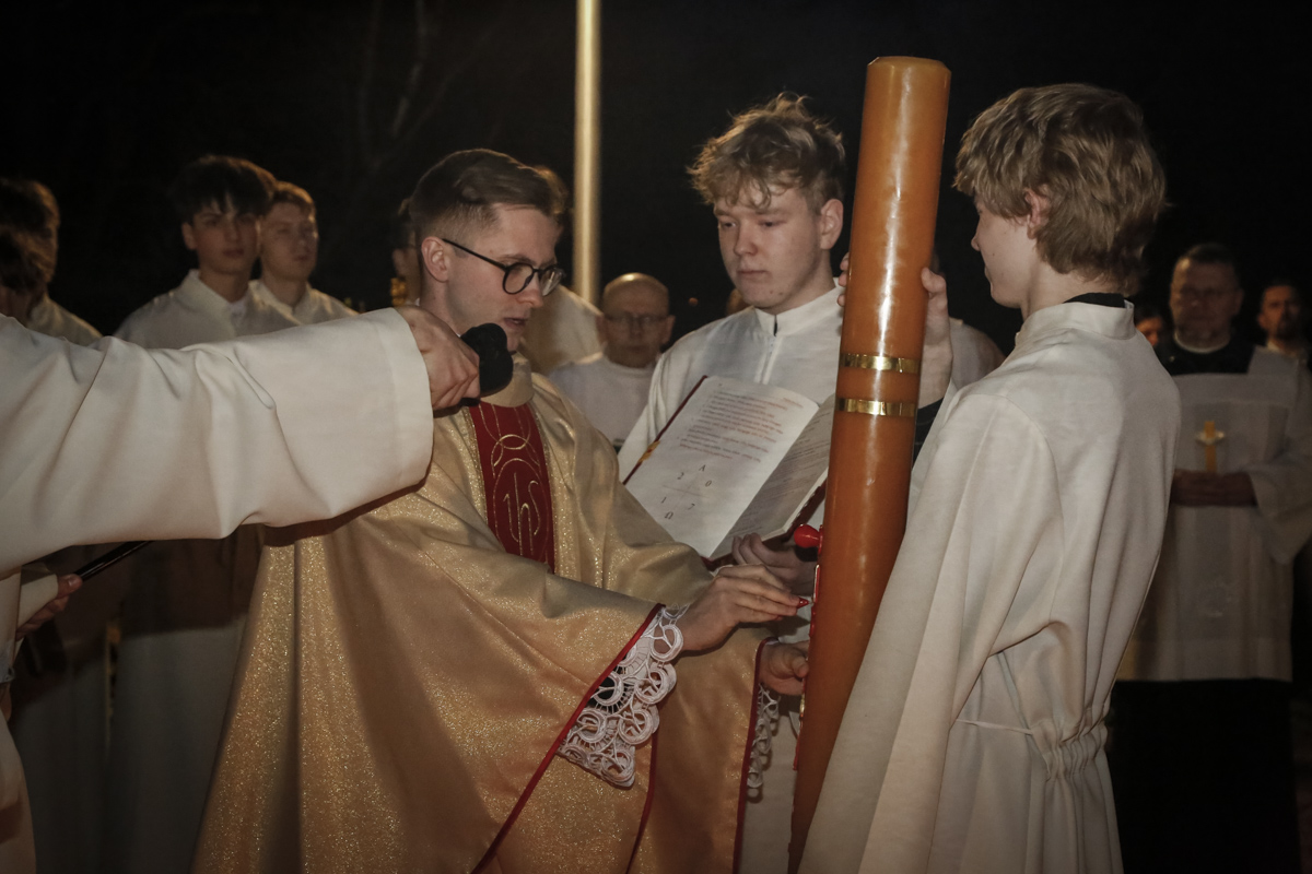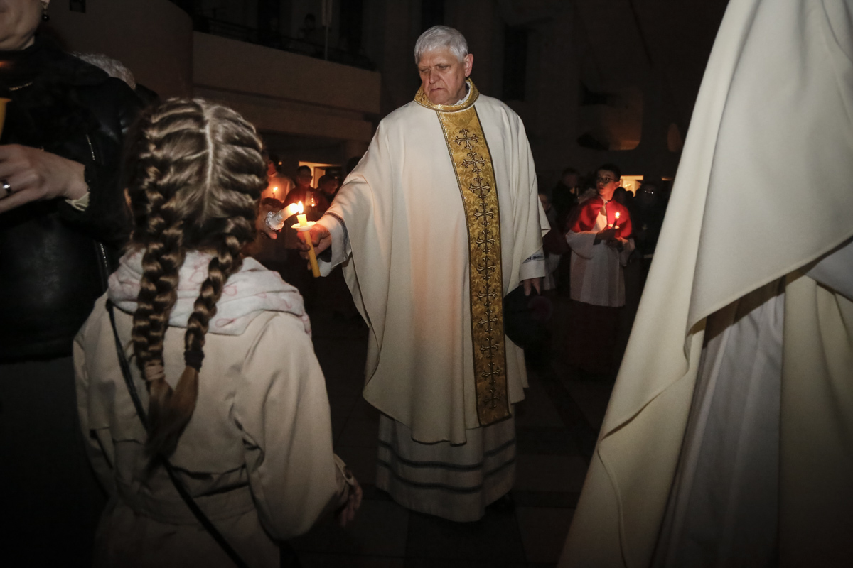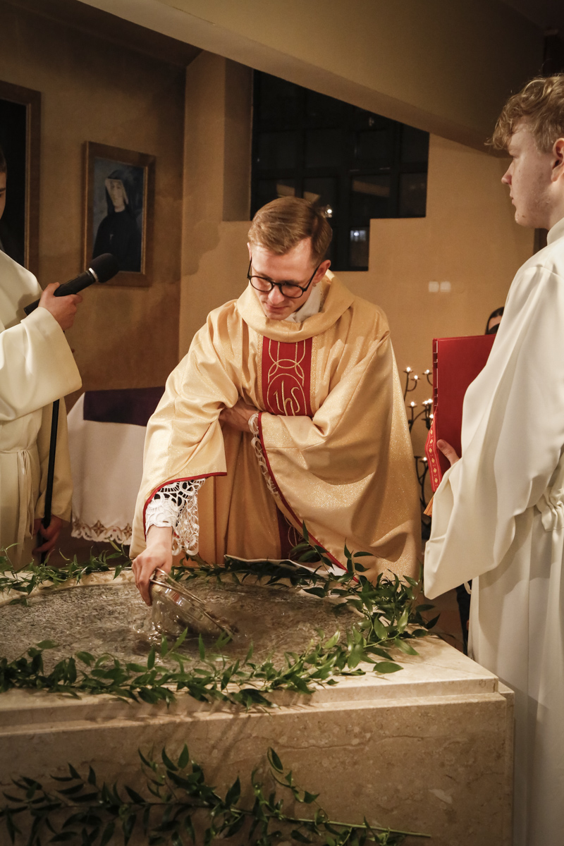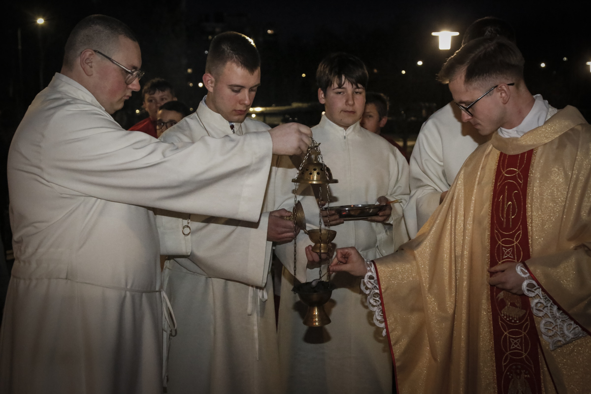 Po usłyszeniu Ewangelii oraz kazania następił obrzęd poświęcenia wody chrzcielnej, podczas którego cała wspólnota odnowiła swoje przyrzeczenia chrzcielne, deklarując wiarę i wyrzeczenie się zła. Uwieńczeniem tej wyjątkowej nocy była Liturgia Eucharystyczna, będąca pierwszą w pełni wielkanocną ucztą ofiarną. Posłuchaj fragmentów ze Mszy Świętej w Wigilię Paschalną.