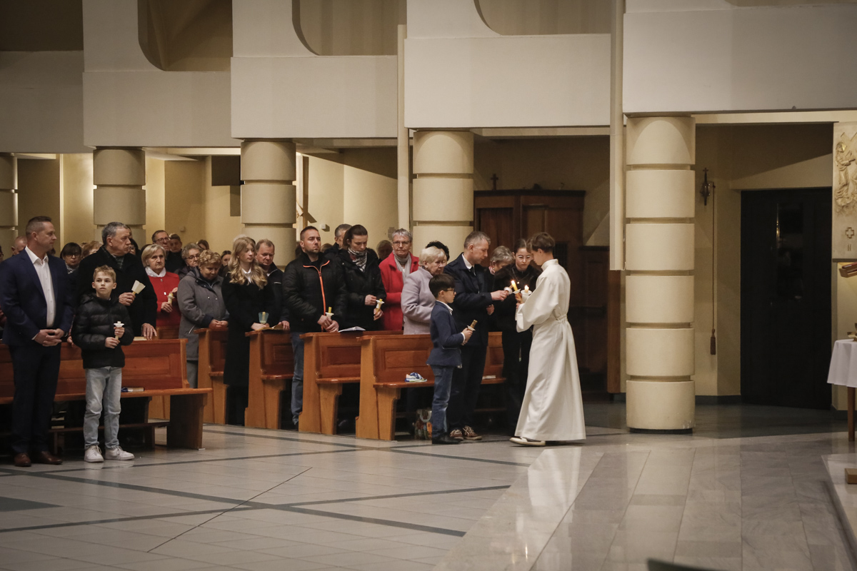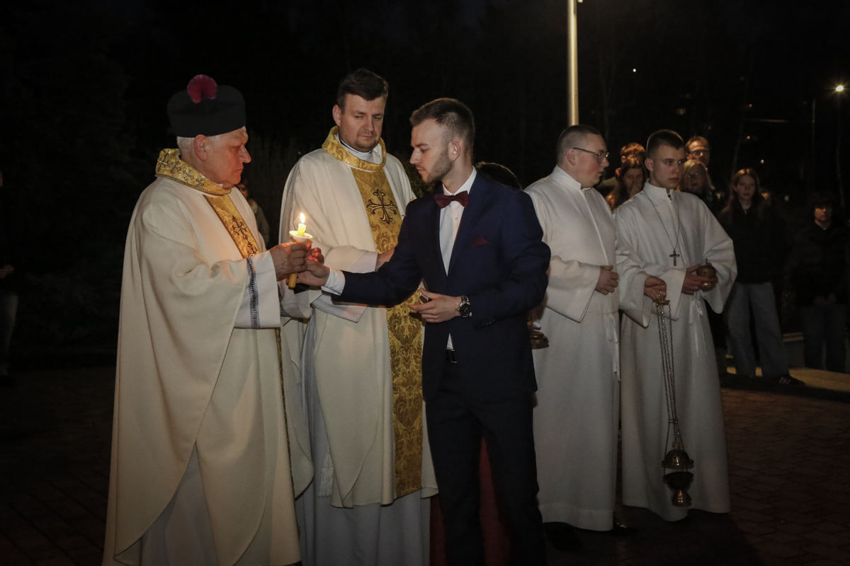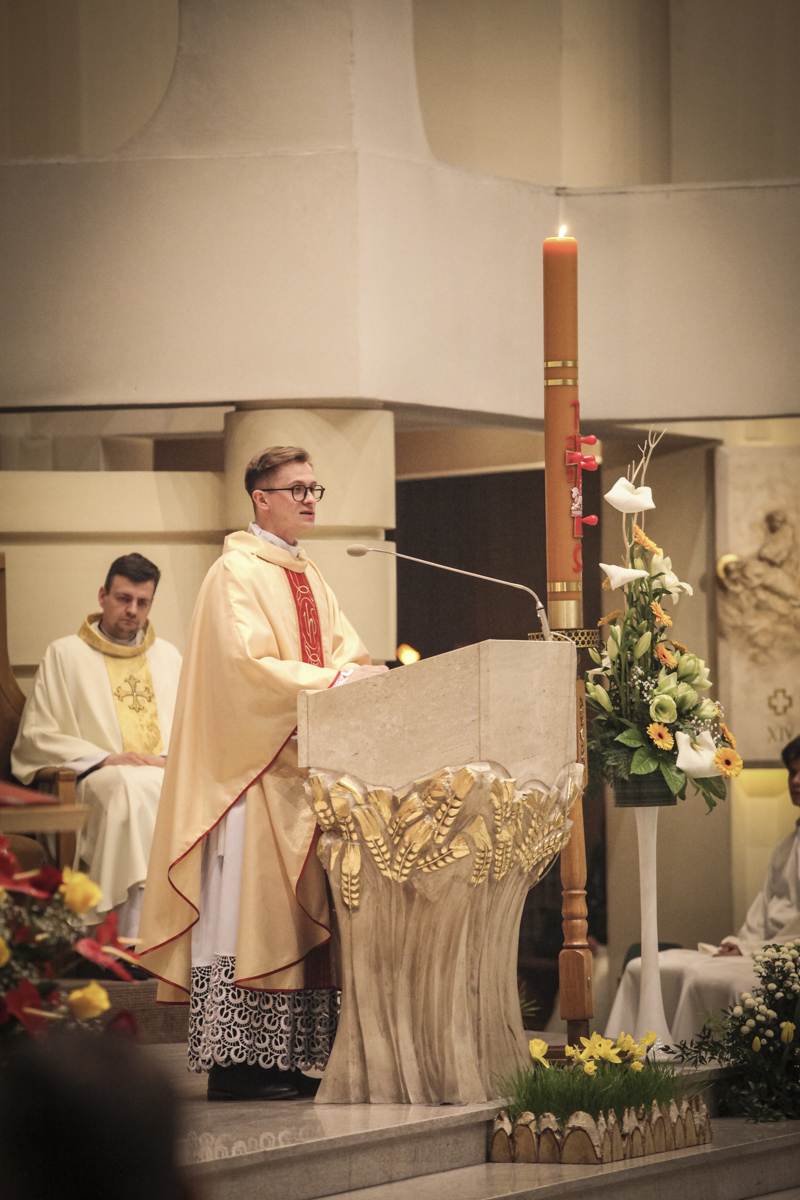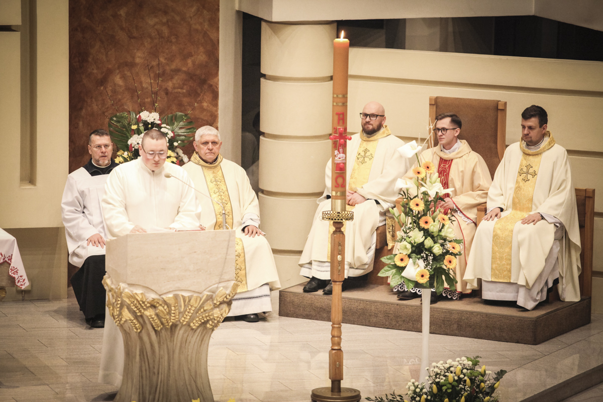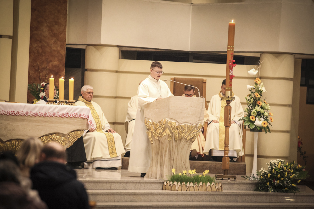 Po usłyszeniu Ewangelii oraz kazania następił obrzęd poświęcenia wody chrzcielnej, podczas którego cała wspólnota odnowiła swoje przyrzeczenia chrzcielne, deklarując wiarę i wyrzeczenie się zła. Uwieńczeniem tej wyjątkowej nocy była Liturgia Eucharystyczna, będąca pierwszą w pełni wielkanocną ucztą ofiarną. Posłuchaj fragmentów ze Mszy Świętej w Wigilię Paschalną.
